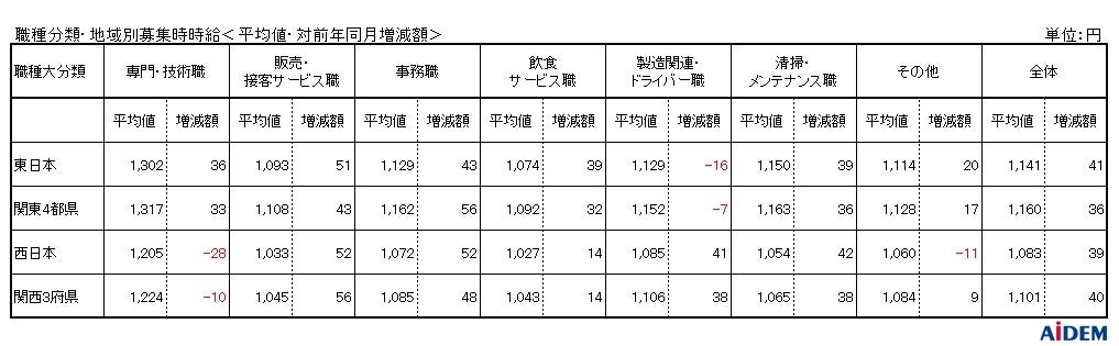 職種大分類別の平均時給は、「専門・技術職」1,224円(前年同月比10円減)、「製造関連・ドライバー職」1,106円(同38円増)、「事務職」1,085円(同48円増)、「清掃・メンテナンス職」1,065円(同38円増)、「販売・接客サービス職」1,045円(同56円増)、「飲食サービス職」1,043円(同14円増)の順で、前年同月比でプラスが5職種、マイナスが1職種となった。府県別の平均時給は、大阪府1,138円(前年同月比44円増)、京都府1,086円(同34円増)、兵庫県1,056円(同39円増)の順となり、前年同月比で全ての府県がプラスとなった。