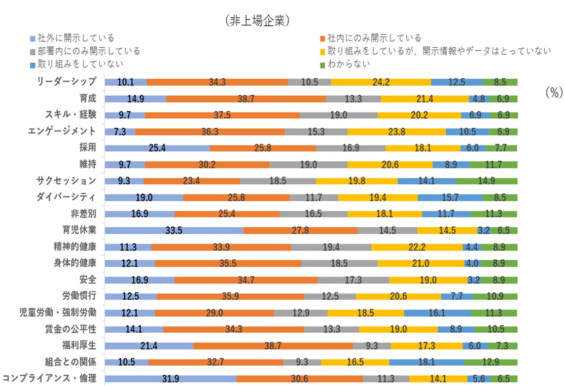 ■社外への開示が進んでいるのは、「コンプライアンス・倫理」「育児休業」「ダイバーシティ」「採用」