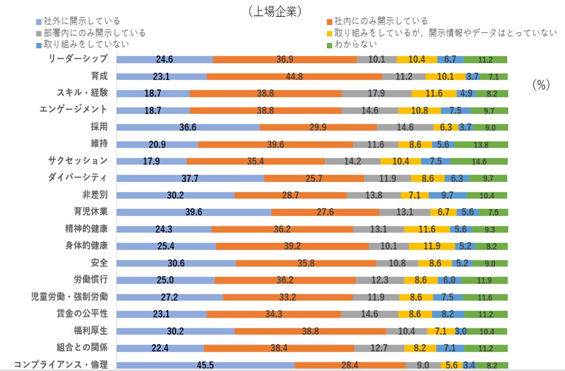 人的資本経営の開示状況について7分野19項目で聞いてみたところ、上場企業で「社外に開示している」が多かった項目は、「コンプライアンス・倫理」(45.5%)、「育児休業」(39.6%)、「ダイバーシティ」(37.7%)、「採用」(36.6%)でした。また、非上場企業では、「育児休業」(33.5%)、「コンプライアンス・倫理」(31.9%)、「採用」(25.4%)という結果でした。一方、上場企業で社外への開示が進んでいない項目は「サクセッション」(17.9%)、「スキル・経験」(18.7%)、「エンゲージメント」(18.7%)。とはいえ、一番取り組みが進んでいない「サクセッション」でも、取り組みそのものは77.9%の企業が行っているという結果に(「社外に開示」「社内にのみ開示」「部署内にのみ開示」「取り組みをしているが、開示情報やデータはとっていない」の合計)。取り組み内容をどのような指標で伝えていくのか、というのが人的資本情報開示の難しいところであり、企業の独自性をアピールするための鍵でもあります。今年は開示元年ですが、取り組みを開示する指標については、今後も検討していくべきポイントになるでしょう。