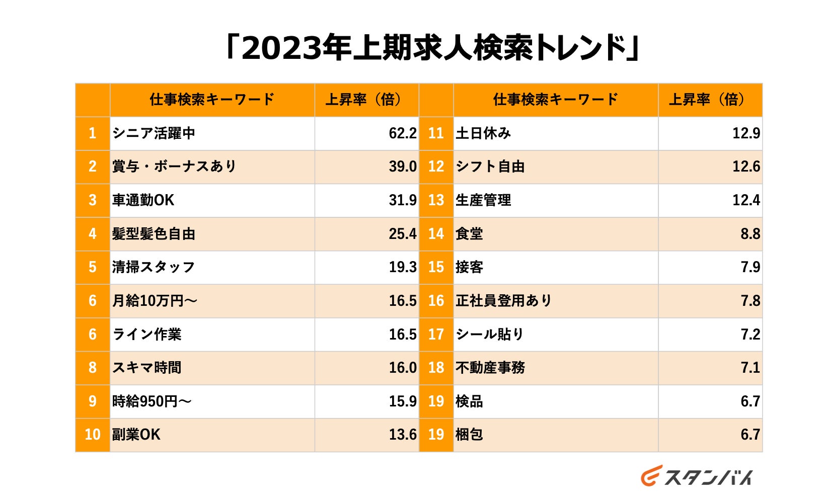 2022年下半期から2023年上半期の最も上昇率の高かった仕事検索キーワードは、「シニア活躍中」(半期比較62.1倍、以下括弧内は半期比較の倍率)でした。背景には、国内の慢性的な人手不足に対する政府による高齢者の就労促進による後押しなどが推測できます。
