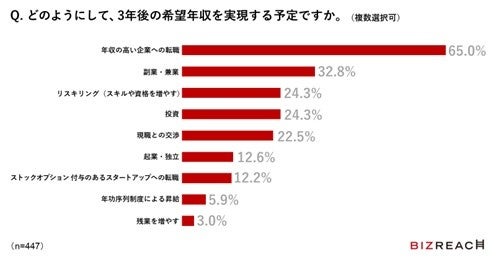 3年後の希望年収について年収を上げたいと回答した方に、それを実現するための具体的な方法を聞いたところ、「年収の高い企業への転職(65.0%)」が最も多く、次いで「副業・兼業(32.8%)」「リスキリング(スキルや資格を増やす)(24.3%)」「投資(24.3%)」という結果になりました。