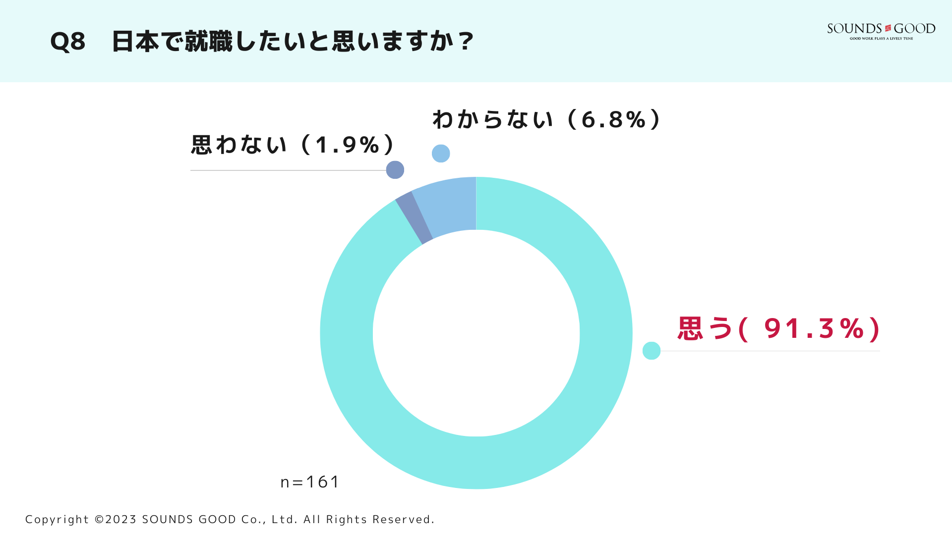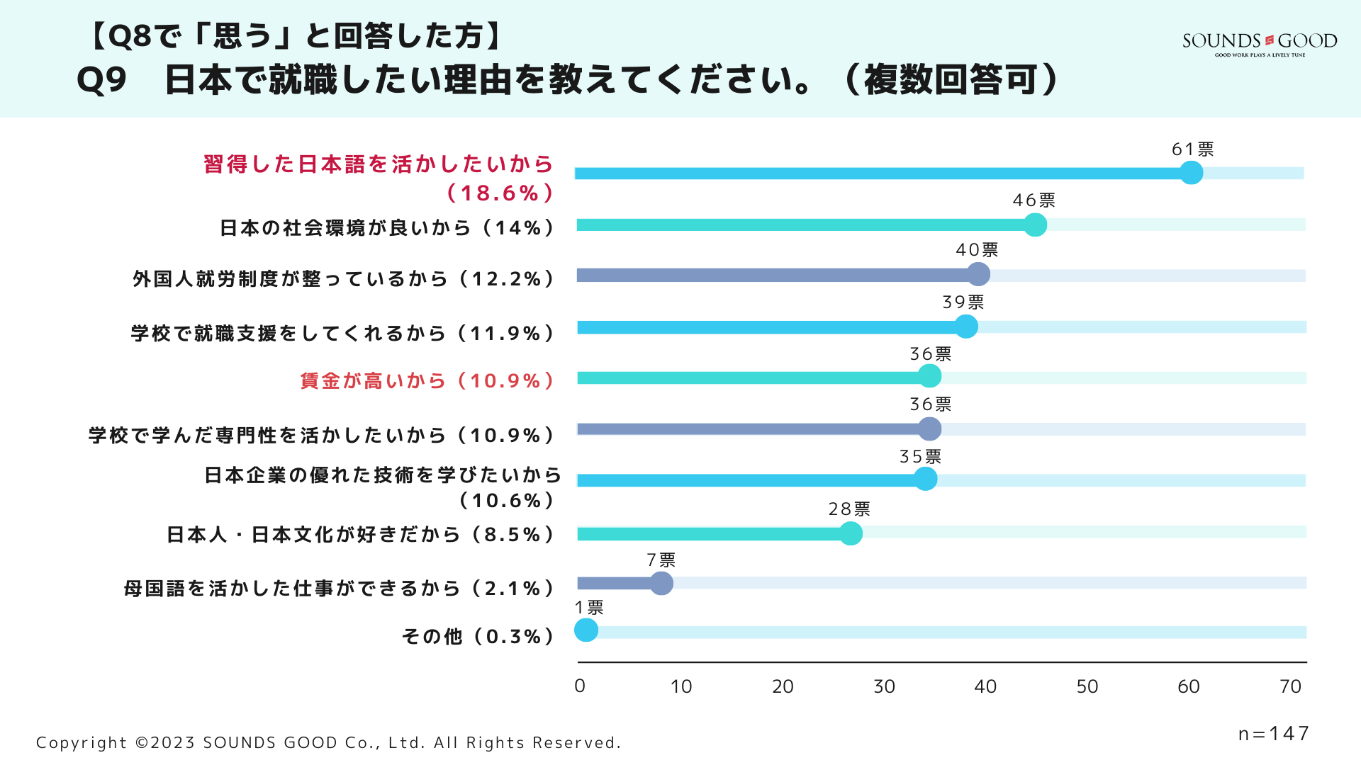 前問で「思う」と解答した147名にその理由を伺うと、「日本語を活かしたいから」が61票で首位となり、母国比較では”高い”とされた賃金に関する支持は、回答数全体の10%(36票)に留まりました。