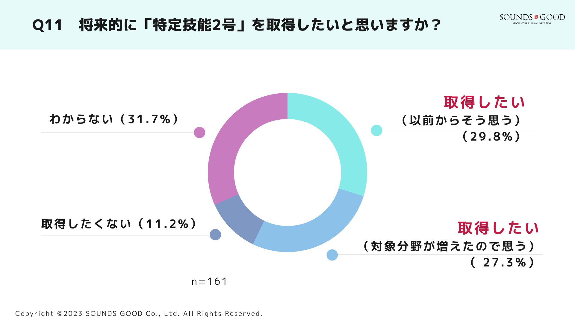 また、今年6月に対象拡大が発表された「特定技能2号」について伺うと、合計57.1%が「取得したい」と答え、そのうちの約半数は、対象分野が拡大したことで取得への意欲が起きたことがわかりました。