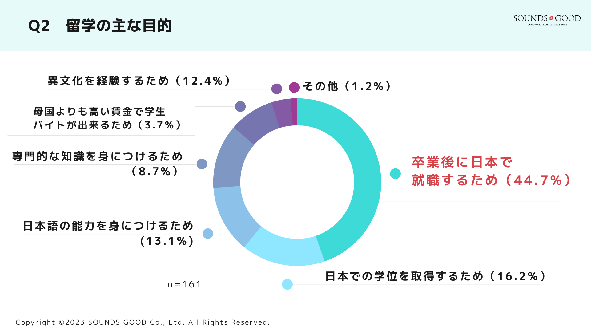 海外留学の主な目的を伺うと、第1位は「卒業後に日本で就職するため」となり、多くの外国人が短期的な語学留学ではなく、日本での就職を目指した長期的な滞在を希望としていることがわかりました。