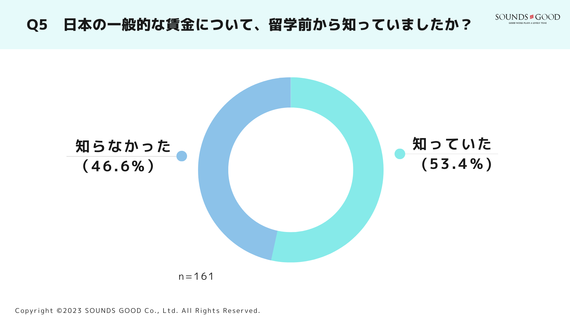 日本での一般的な賃金について留学前から知っていたかを伺うと、53.4%の人が「知っていた」、46.6%の人が「知らなかった」と答えました。