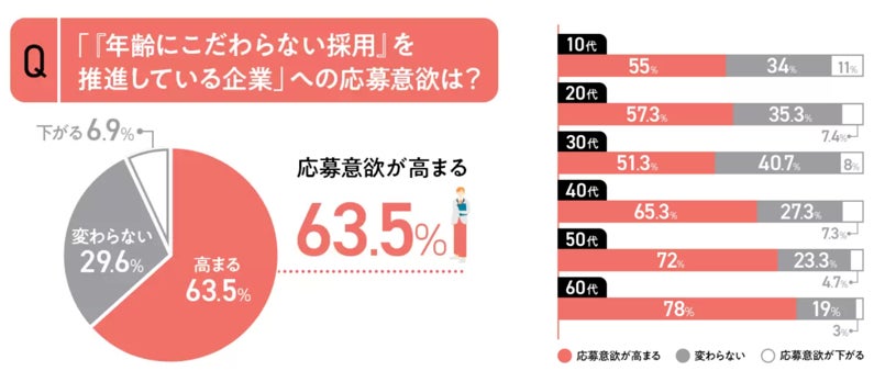 本調査によれば、「『年齢にこだわらない採用』を推進している企業」に対して、「応募意欲が高まる」と回答した人は全体で63.5%となりました。年代別に見ても、全ての年代で半数以上が「応募意欲が高まる」と回答しており、年齢にこだわらない採用は、求職者にとって仕事選びの際にプラスの影響を与えていることが分かります。
