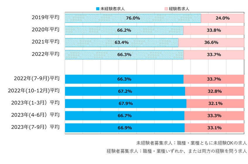 求人の経験者・未経験者の募集比率は、未経験者求人が66.9%、経験者求人が33.1%だった。今回は前回の2023年4-6月(未経験者:66.7%、経験者:33.3%)とほぼ変わらず、2022年平均(未経験者:66.3%、経験者:33.7%)と比較しても同程度の数値となった。【図3】