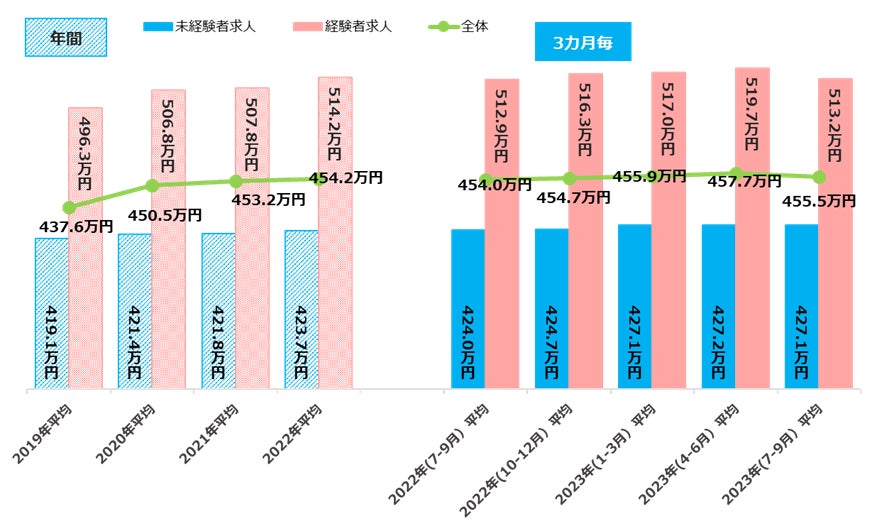 1. 23年7‐9月の平均初年度年収は455.5万円。求人掲載数は2019年比149.7%と、企業の人材獲得意欲は引き続き高い状態で推移【図1、2、3】