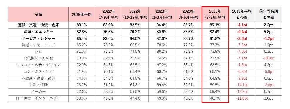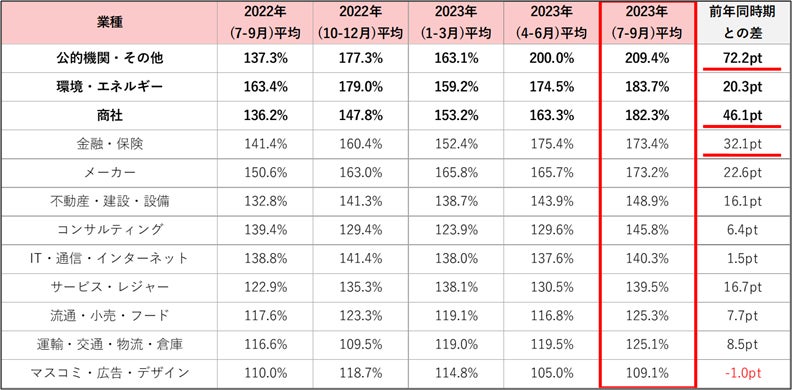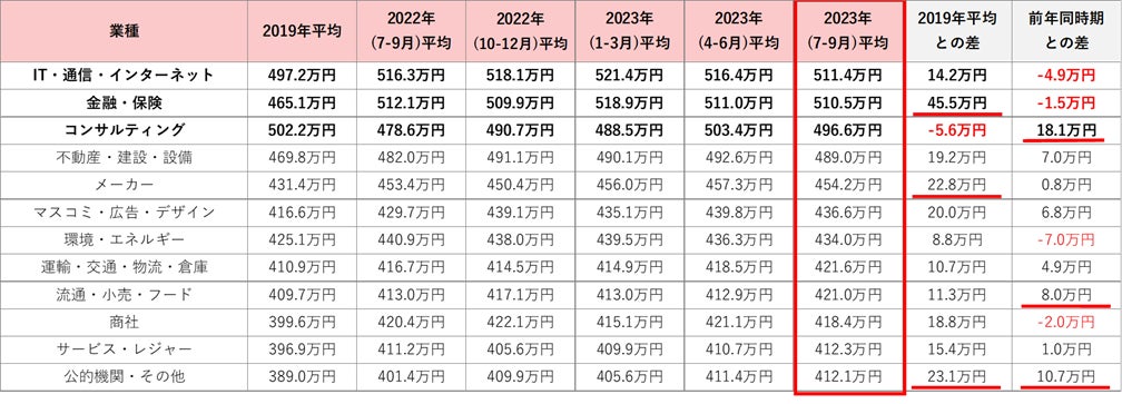 23年7-9月の平均初年度年収は455.5万円。業種別では「IT・通信・インターネット」が最も高く511.4万円。求人件数は2019年平均比149.7%で前年同時期から15.9ptの大幅増加