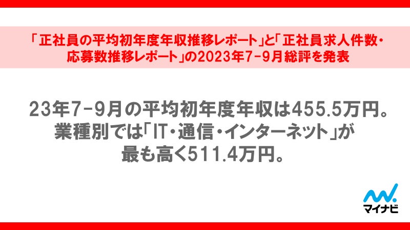 株式会社マイナビ(本社:東京都千代田区、代表取締役 社長執行役員:土屋芳明)が運営する総合転職情報サイト『マイナビ転職』(https://tenshoku.mynavi.jp/)は、「正社員の平均初年度年収推移レポート」と「正社員求人件数・応募数推移レポート」について、2023年7-9月の総評を発表しました。本調査は、総合転職情報サイト『マイナビ転職』に掲載された求人の「平均初年度年収(未経験・経験者求人別)」、「求人件数・応募数」の推移を調査したものです。