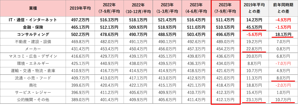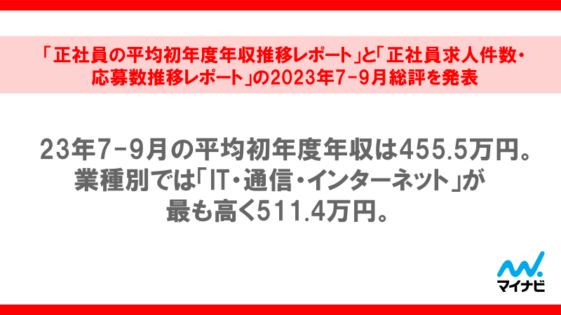 23年7-9月の平均初年度年収は455.5万円。業種別では「IT・通信・インターネット」が最も高く511.4万円。求人件数は2019年平均比149.7%で前年同時期から15.9ptの大幅増加