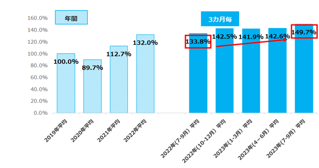 求人件数は2019年平均比149.7%で、前年同時期の2022年7-9月平均から15.9pt増加した。3カ月ごとでみると、前回の2023年4-6月の142.6%から7.1pt増加し、企業の人手不足感はさらに高まっている。【図2】