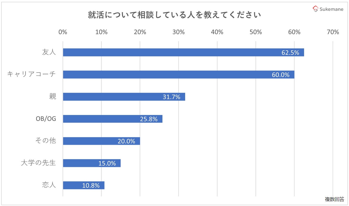 就活に関する相談相手は1位が友人で62.5%、2位がキャリアコーチで60%となっています。