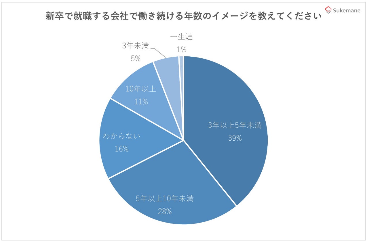 5%が「3年未満」、39%が「3~5年未満」、28%が「5年~10年未満」を選択し、合計で7割以上が「10年未満」を想定していることが明らかになりました。転職やキャリアチェンジ、ライフスタイルの変化を前提にしてファーストキャリアに踏み出そうとする割合が多くを占める一方で、「10年以上」の回答が約1割、「わからない」も約15%となりました。