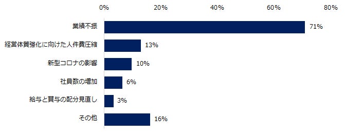 増額予定の企業に理由を伺うと、トップ3は「社員の意欲向上」(53%)、「業績が好調」(50%)、「物価上昇への対応」(46%)でした。一方で減額予定の企業の理由は「業績不振」(71%)が最多でした。