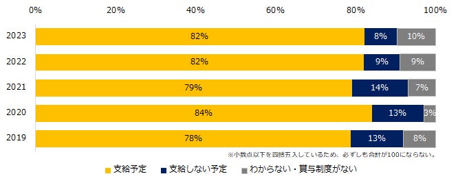 「2023年、冬季賞与は支給予定ですか?」と伺うと、82%の企業が「支給予定」と回答。昨年から変化はありませんでした。