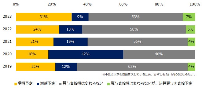 2023年冬季賞与を支給予定の企業に「昨年の冬季賞与と比較し、支給額に変動はありますか?」と伺うと、31%の企業が「増額予定」と回答。新型コロナウイルスが流行した2020年以降、前年と比較し「増額予定」と回答している企業が毎年増加し、2023年は過去5年の中で最も多い結果となりました。