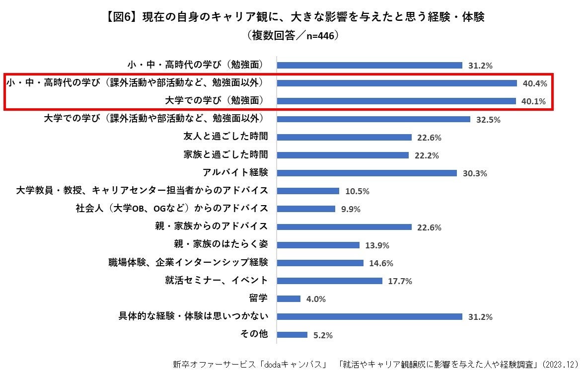 現在の自身のキャリア観に大きな影響を与えた経験・体験については、1位「小・中・高校時代の学び(課外活動や部活動など、勉強面以外)」(40.4%)となり、2位「大学での学び(勉強面)」(40.4%)とは僅差となりました。(【図6】参照)