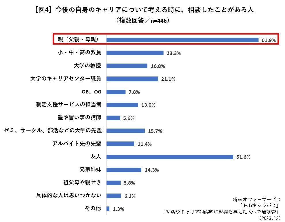 自身の今後のキャリアを考える時にこれまで相談したことがある人については、1位「親(父親・母親)」(61.9%)、2位は「友人」(51.6%)となりました。(【図4】参照)