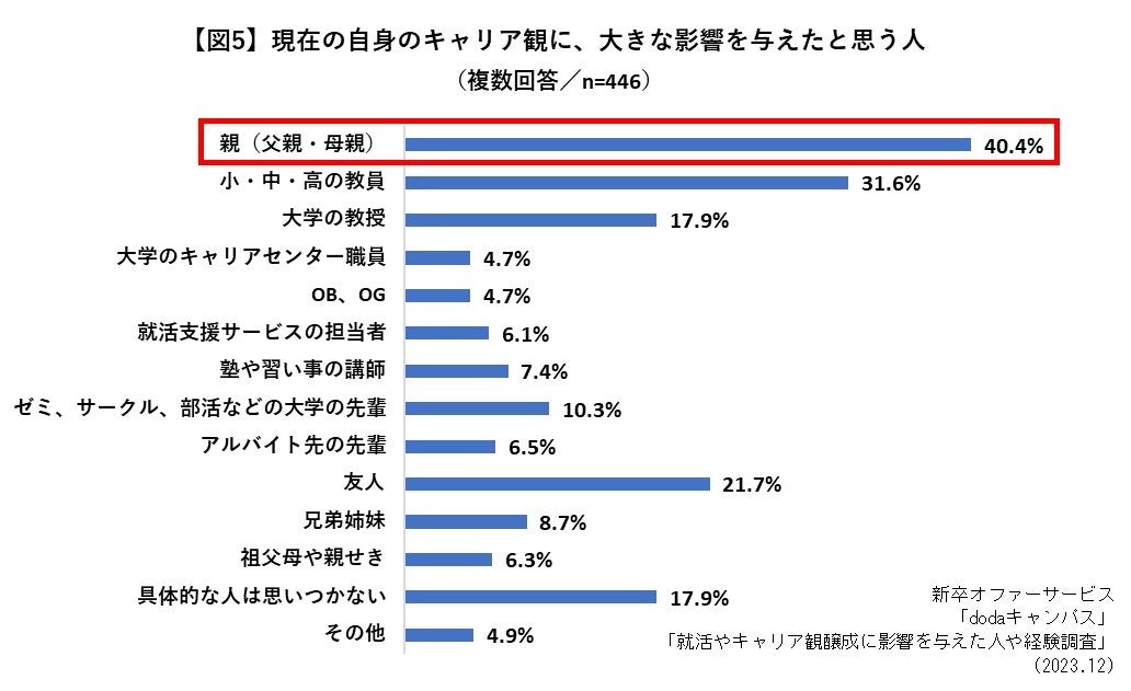 現在の自身のキャリア観に大きな影響を与えた人については、1位「親(父親・母親)」(40.4%)、2位「小・中・高校の教員」(31.6%)となりました。(【図5】参照)