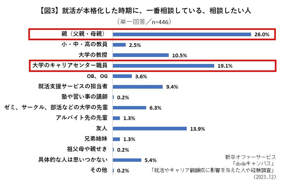 就活が本格化した時期に一番相談している(したい)人の1位は「親(父親・母親)」(26.0%)