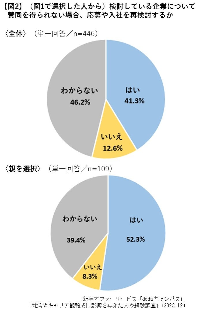 「検討している企業について、相談した人から賛同を得られない場合は応募や入社を再検討する」と回答した学生の割合は、全体で41.3%だったのに対し、「親(父親・母親)」を選択した場合、52.3%と約10pt増加することがわかりました。(【図2】参照)