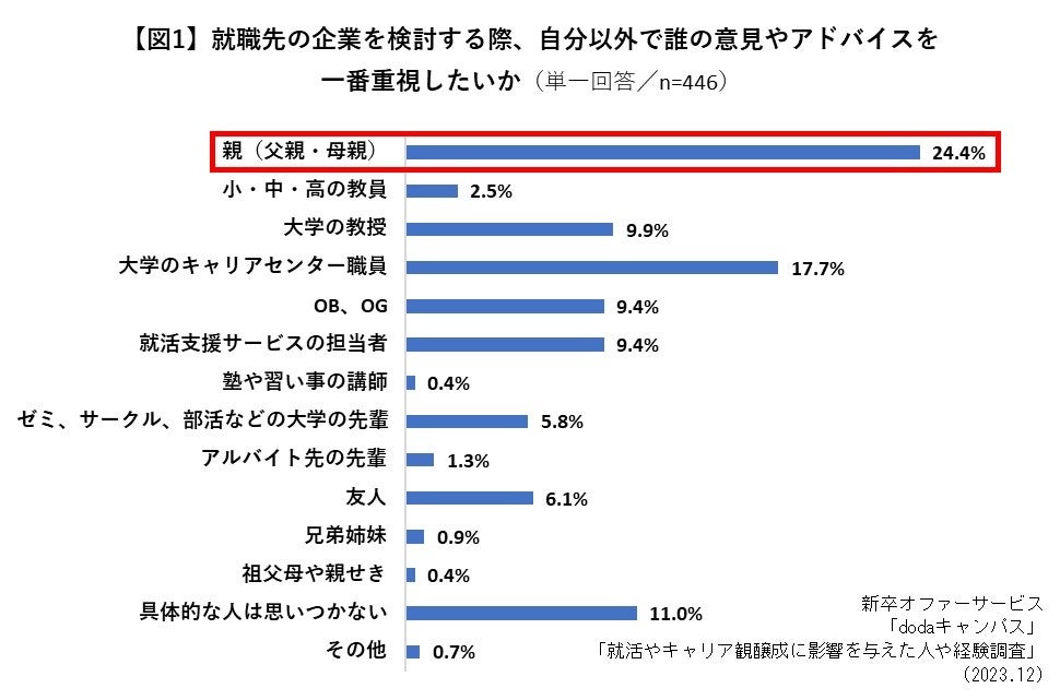 「4人に1人」が、就職先の企業を検討する際に「親(父親・母親)」の意見やアドバイスを最重視したい(24.4%)と回答