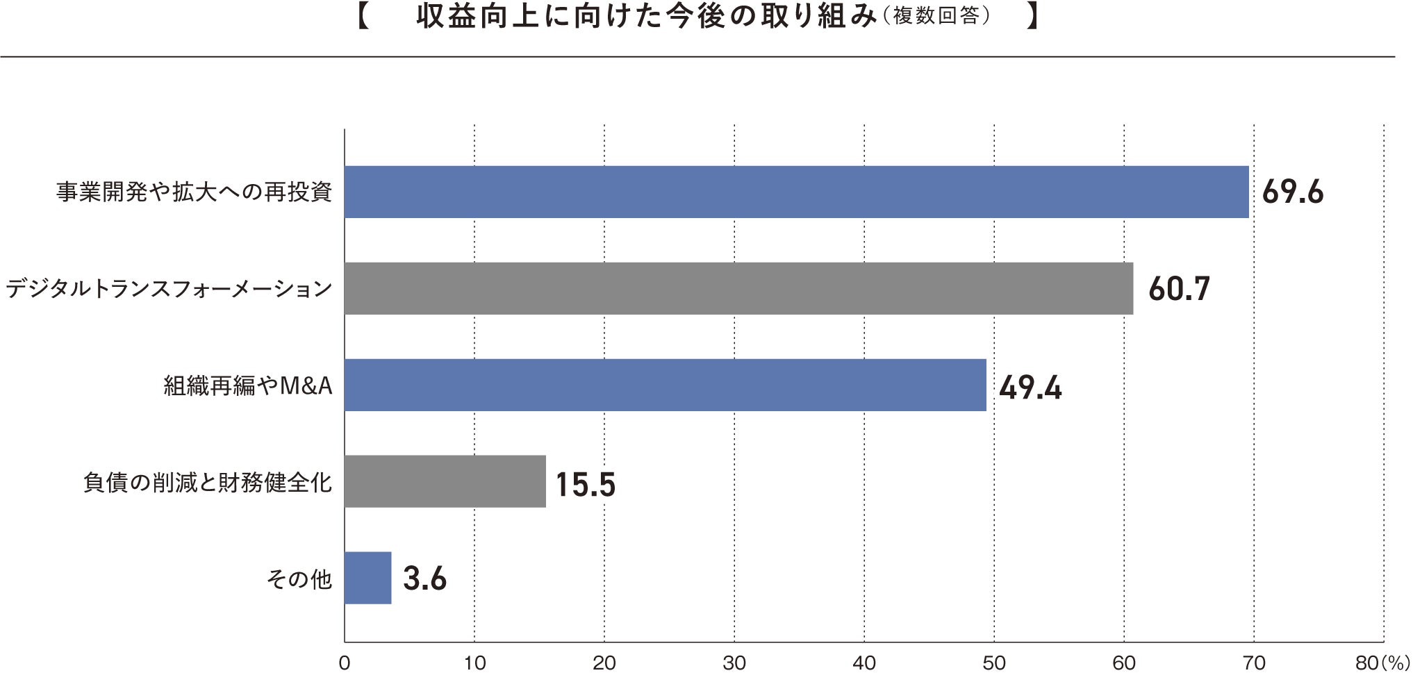 (3)収益向上に向けた今後の取り組みについては、「事業開発や拡大への再投資」が最多、次いで「DX(デジタルトランスフォーメーション)への投資」という結果になりました。