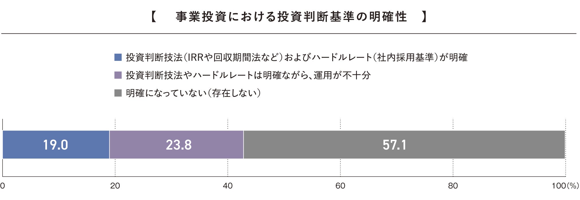本アンケートは上場企業を中心に調査しましたが、上場企業であっても「投資判断基準が明確になっていない」企業が約6割(57.1%)という結果に。また、「投資判断技法やハードルレート(社内採用基準)は明確ながら、運用が不十分」が23.8%という結果からも、十分な投資判断ができている企業は少ないことが分かります。