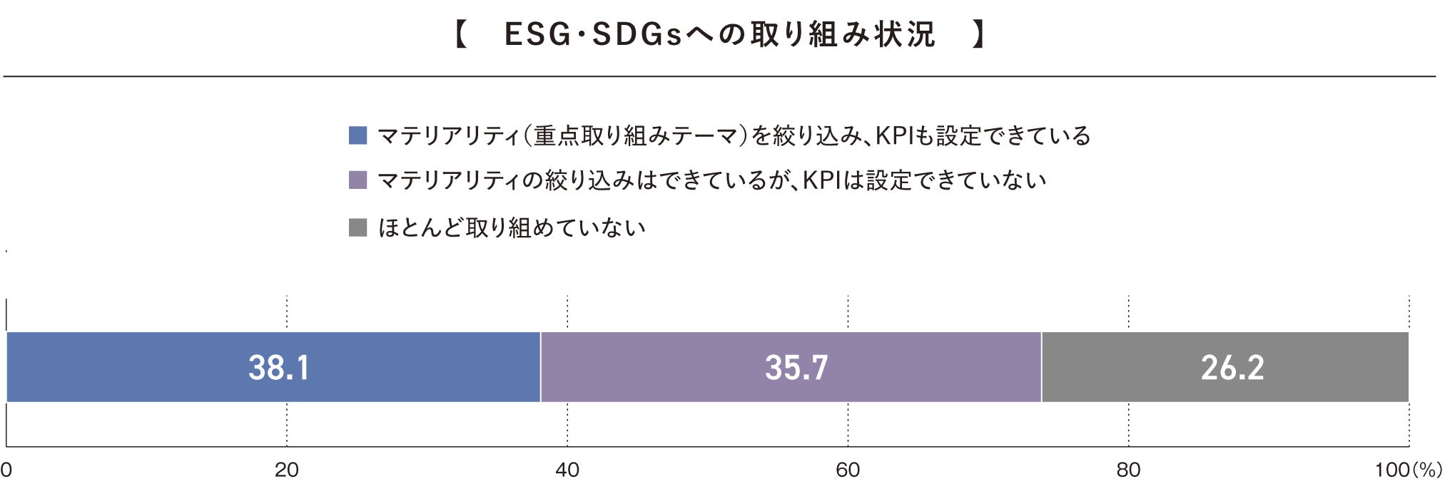 ESG・SDGsへの取り組みをKPIとして定量化しマネジメントしていくことが重要ですが、「マテリアリティ(重要取り組みテーマ)を絞り込み、KPIも設定できている」(38.1%)と回答した企業は4割に満たない結果に。多くの企業が具体的な行動に移せていないという実態がうかがえます。
