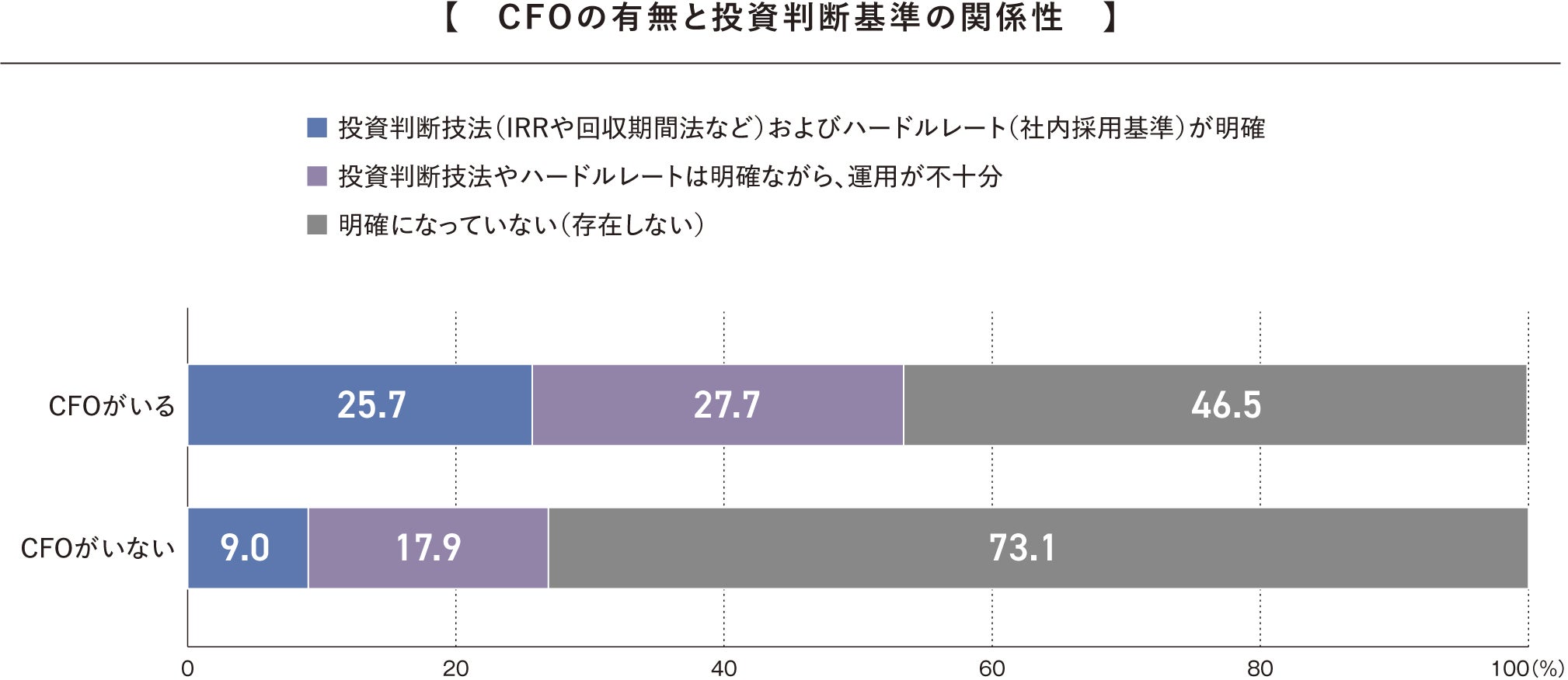 CFOの存在意義が顕著に表れているのが「CFOの有無と投資判断基準の関係性」です。CFOを有する企業の53.4%(25.7%+27.7%)が「投資判断技法が明確」と回答していることに対し、CFOがいない企業で「投資判断技法が明確」と回答した企業は26.9%(9.0%+17.9%)という結果でした。