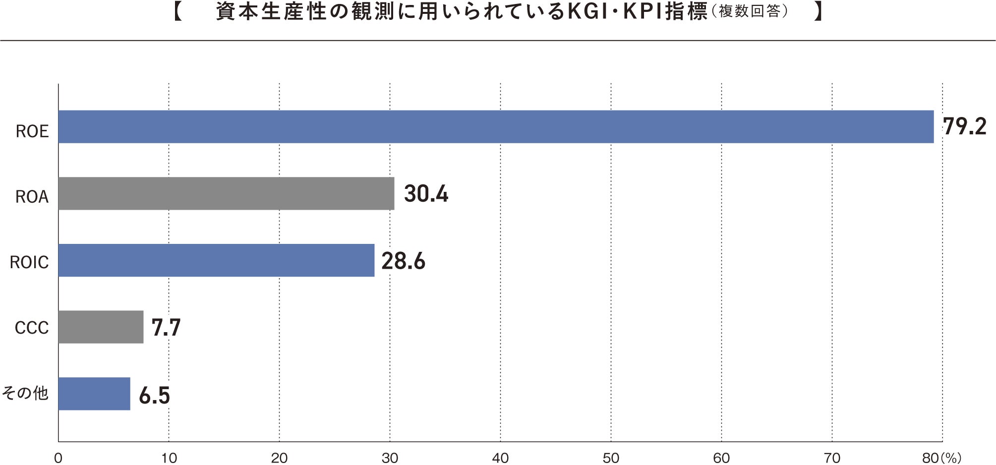 ■約8割が資本生産性を判定する指標として「ROE(自己資本利益率)」を活用。