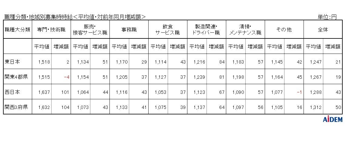 東日本エリア全体の平均時給は、前年同月比21円増の1,247円