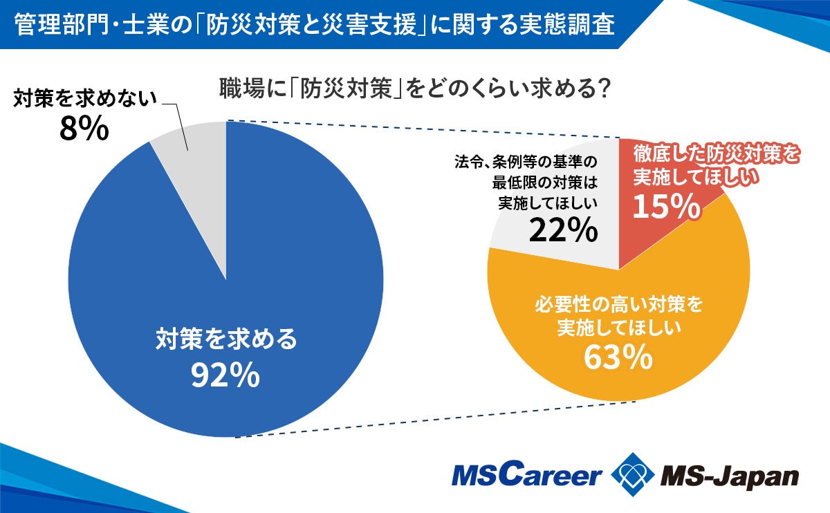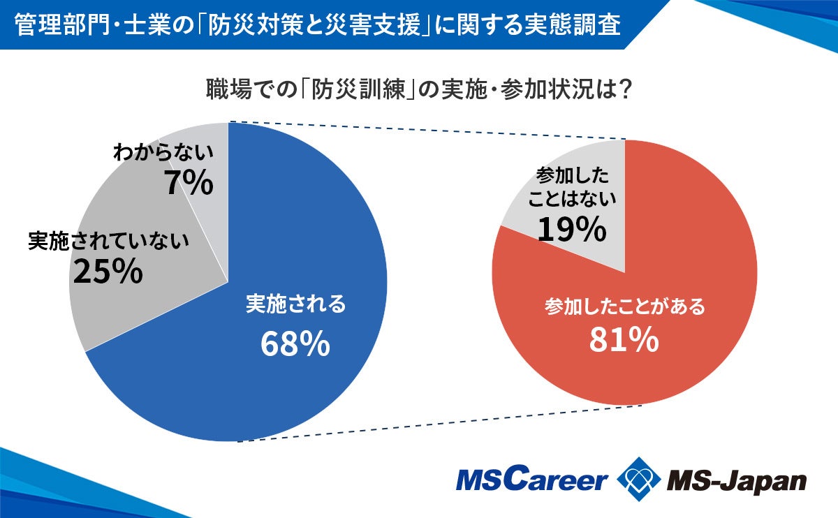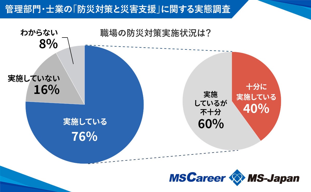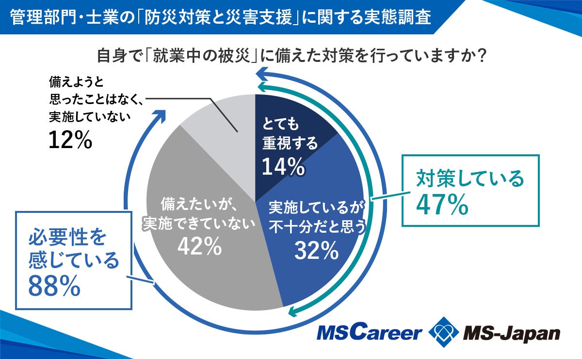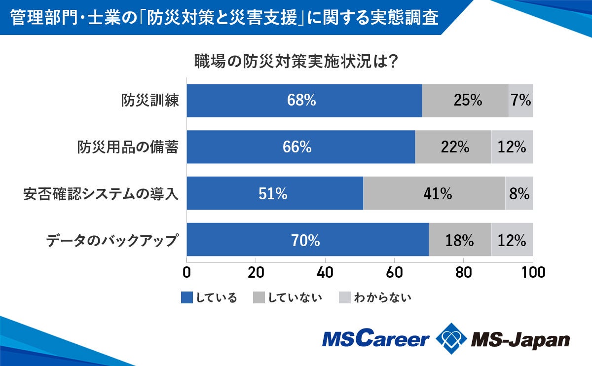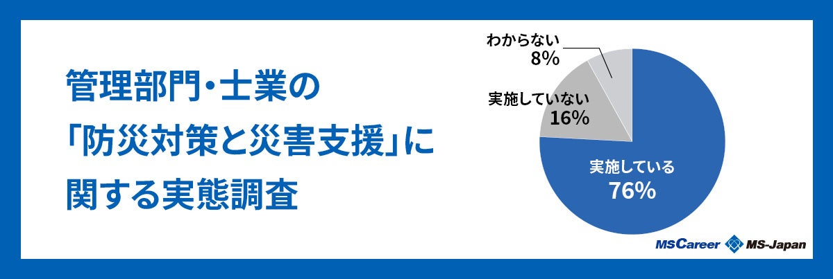 株式会社MS-Japan(本社:東京都千代田区 代表取締役会長兼社長CEO:有本隆浩/以下MS-Japan 証券コード:6539)が運営する、管理部門・士業の総合転職サービス「MS Career(エムエスキャリア)」は、【「職場の防災対策」と「災害支援」に関する実態調査】を発表しましたので、お知らせいたします。本調査は、管理部門・士業のためのビジネスメディア「Manegy(マネジー)」にて管理部門・士業人材335人に実施いたしました。