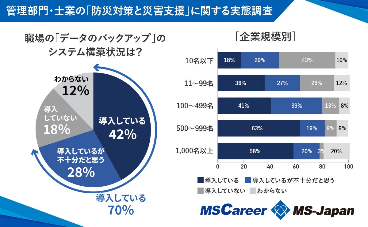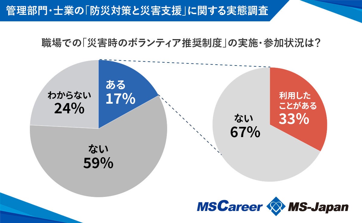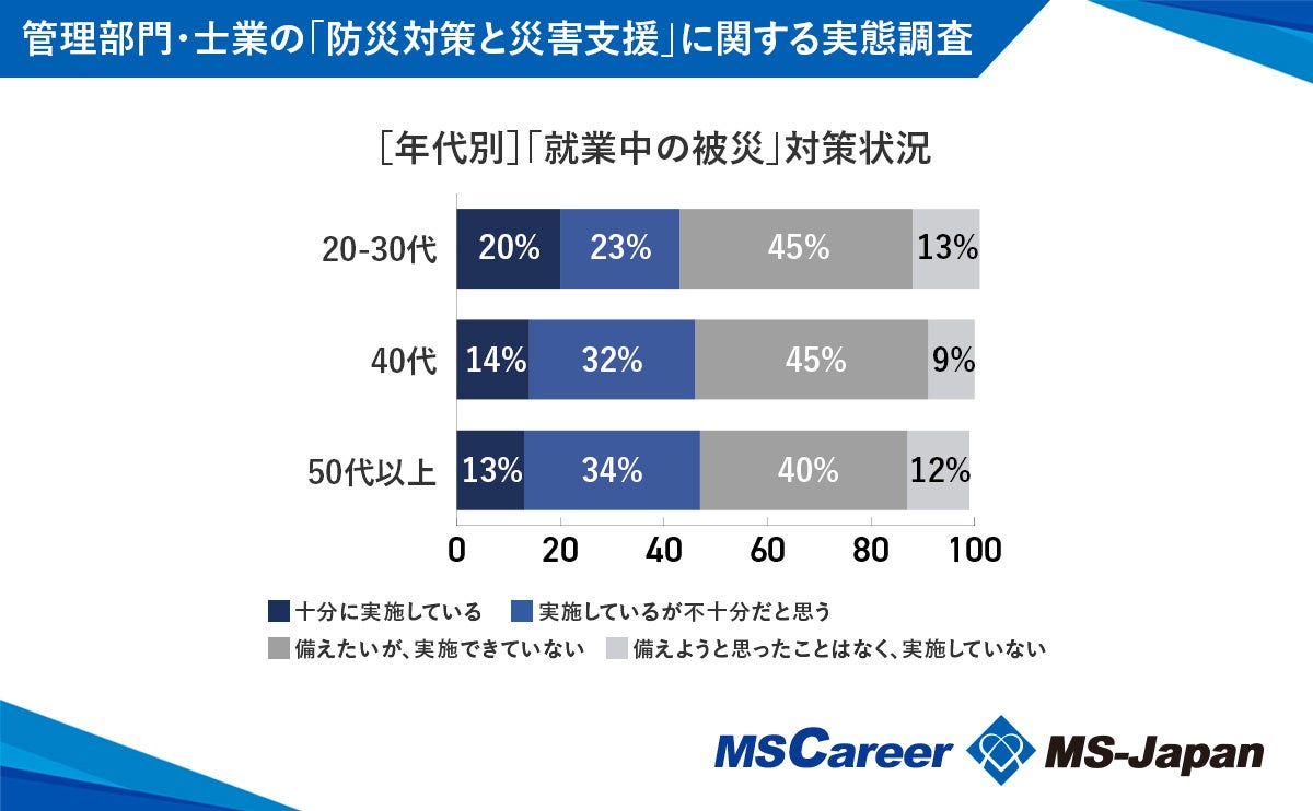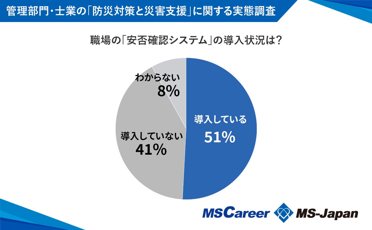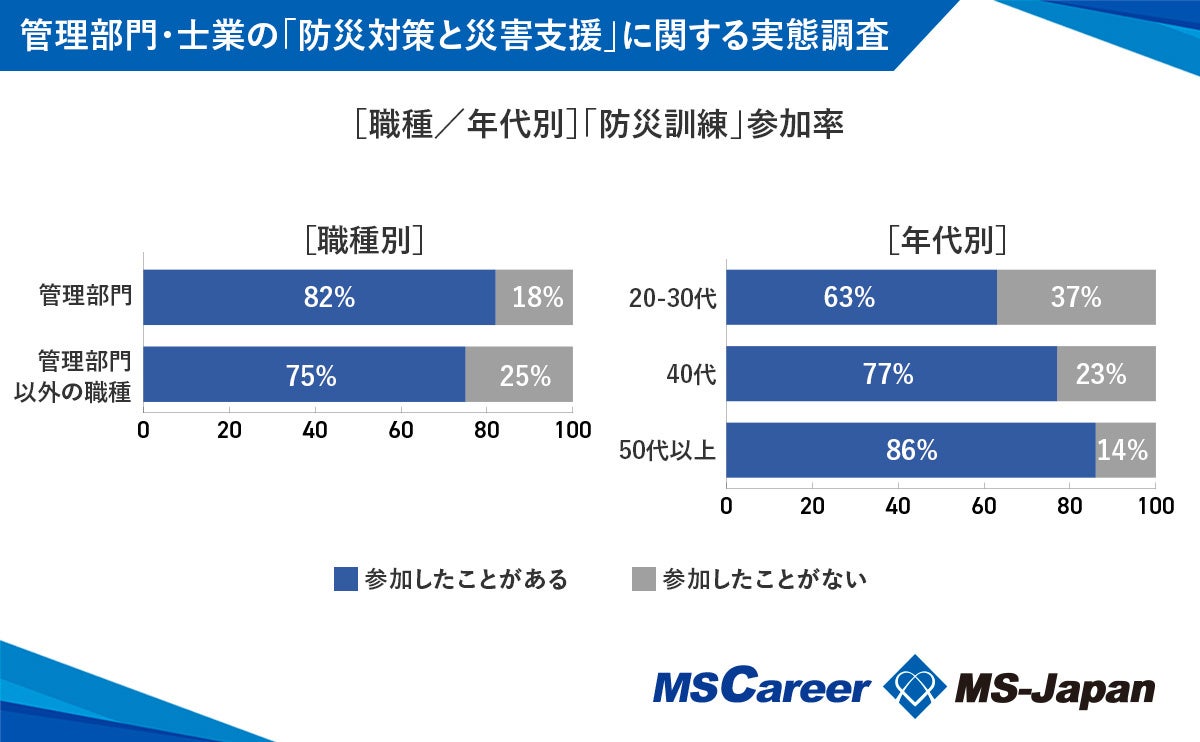 株式会社MS-Japan(本社:東京都千代田区 代表取締役会長兼社長CEO:有本隆浩/以下MS-Japan 証券コード:6539)が運営する、管理部門・士業の総合転職サービス「MS Career(エムエスキャリア)」は、【「職場の防災対策」と「災害支援」に関する実態調査】を発表しましたので、お知らせいたします。本調査は、管理部門・士業のためのビジネスメディア「Manegy(マネジー)」にて管理部門・士業人材335人に実施いたしました。