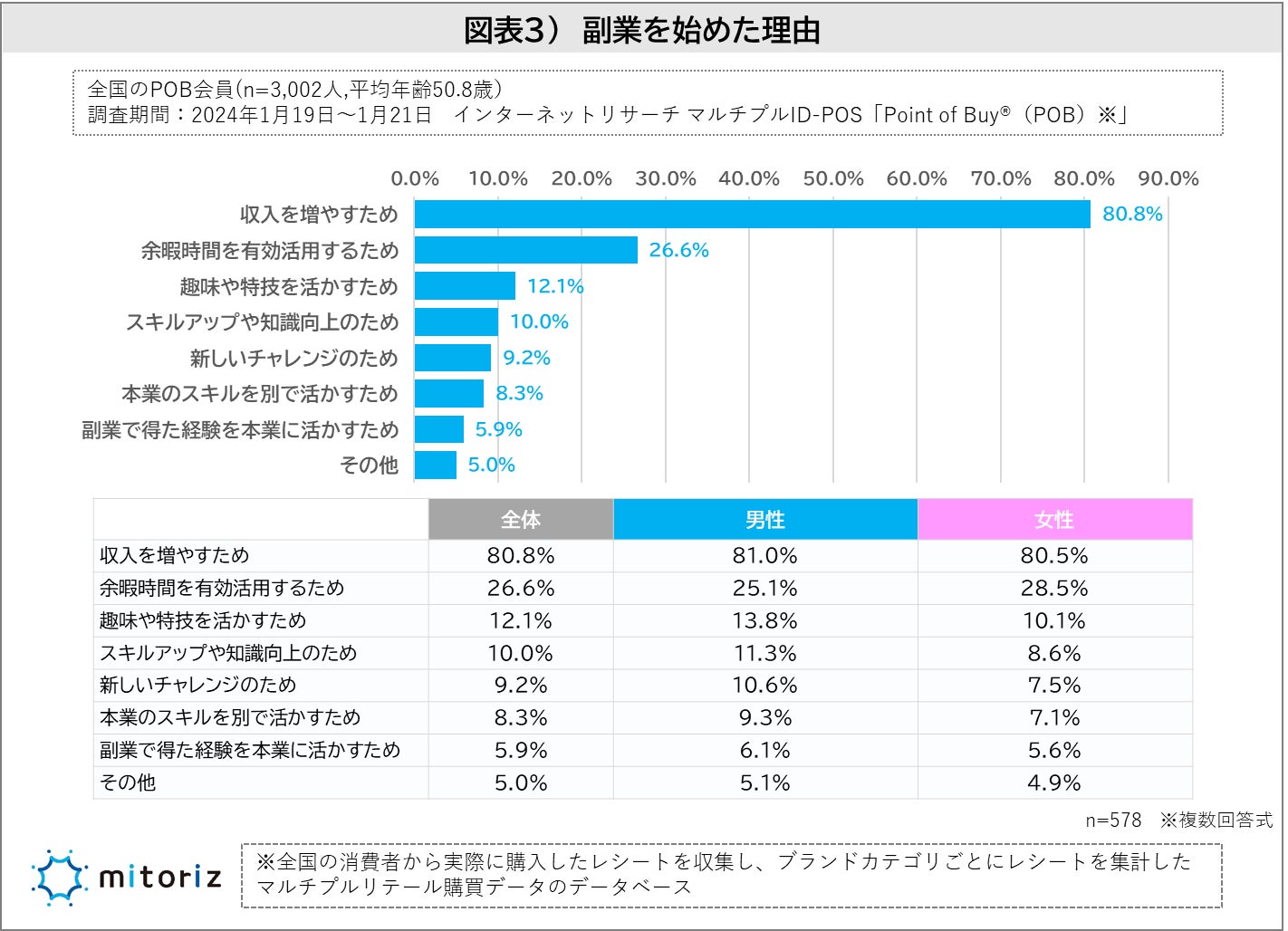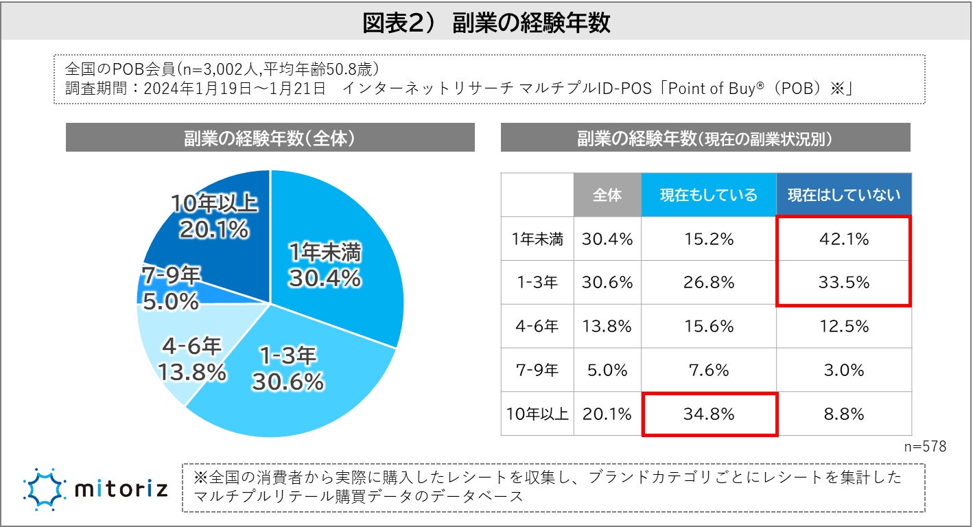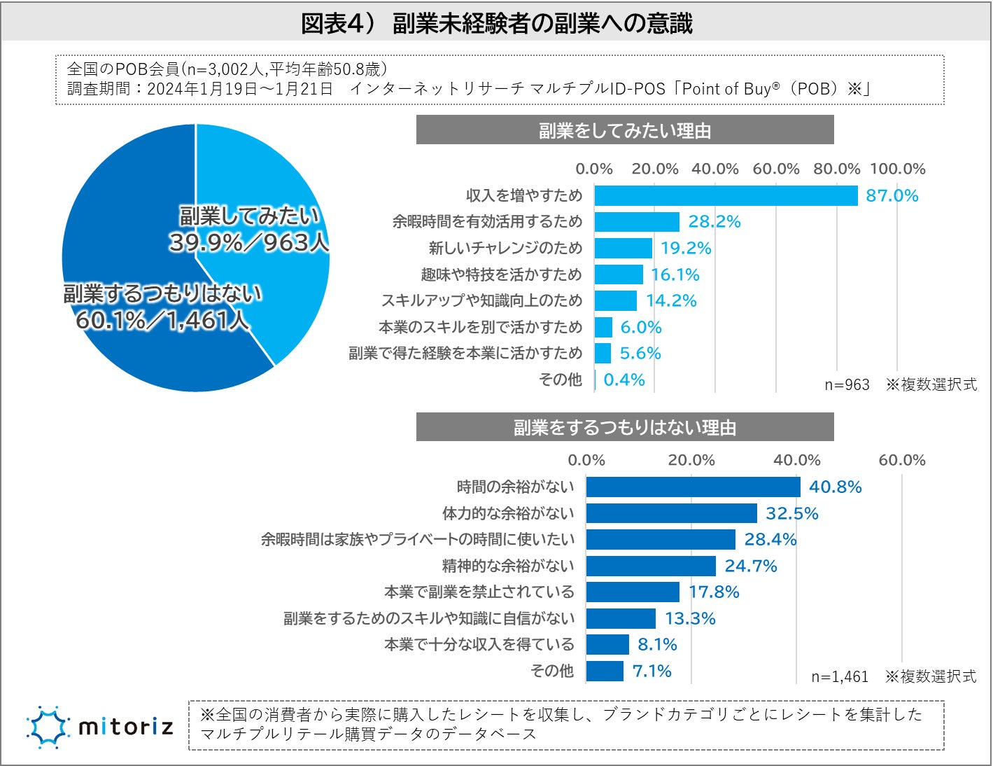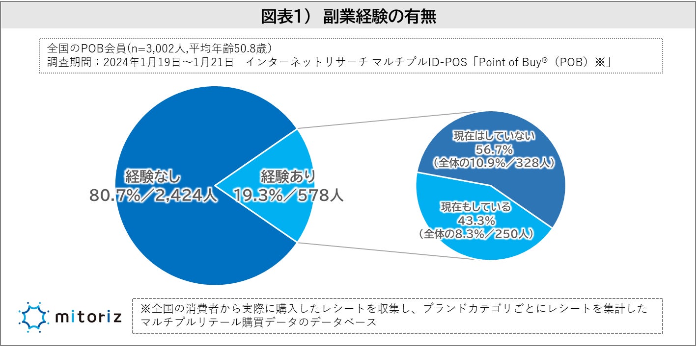 株式会社mitoriz(本社:東京都港区、代表取締役社長:木名瀬博)は、消費者購買行動データサービス「Point of Buy®(以下、POB)」の会員3,002人に「副業に関する調査」を実施致しました。