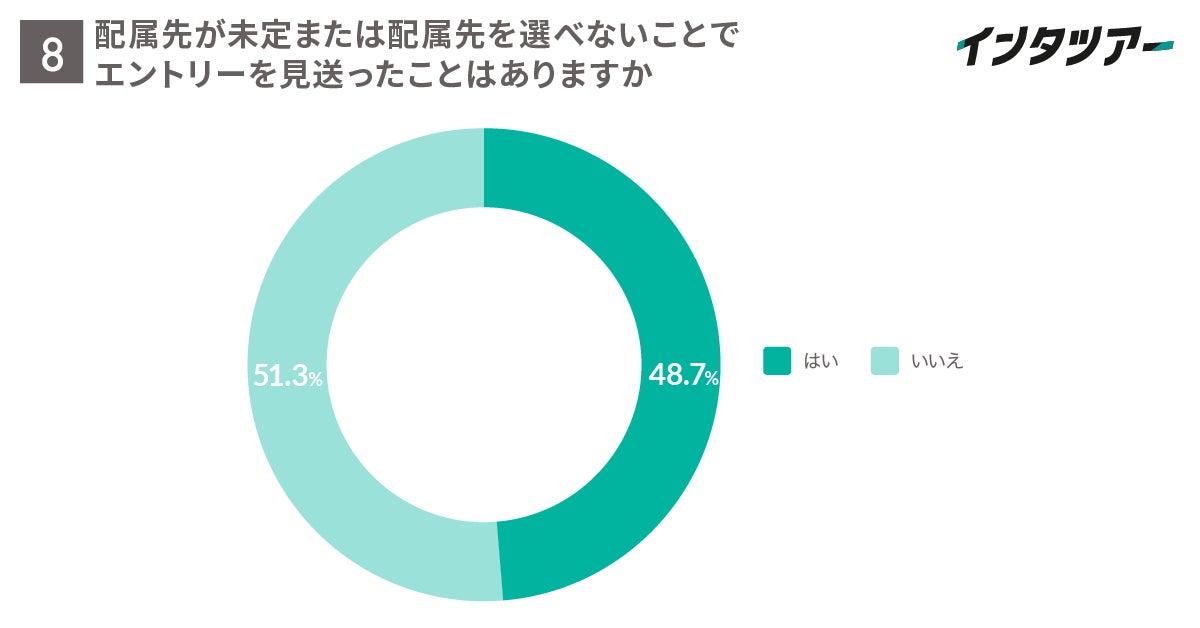 設問8では配属先が未定、または配属先を選べないことでエントリーを見送ったことがあるかどうか聞いたところ、約半数の48.7%が「ある」と回答しました。