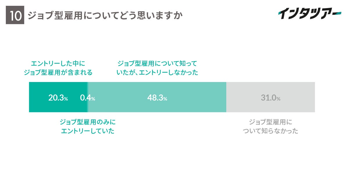 設問10では、業務を明確に分けた職種で採用する「ジョブ型雇用」についてどう思うか聞きました。最も多かった回答は「ジョブ型について知っていたがエントリーしなかった」48.3%でした。2番目に「ジョブ型雇用について知らなかった」31.0%が続きました。ジョブ型雇用について認知している24卒生は69.0%となります。「地域限定社員」「ジョブ型雇用」ともに、いわゆる「配属ガチャ」に対して、勤務地や職種を選べる制度となります。しかし、積極的に勤務地や職種を選択しようとこれらの制度を選んだ24卒生は2割~3割程度にとどまっています。