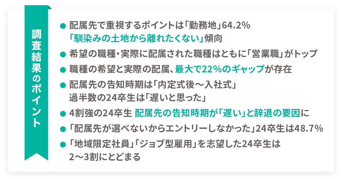 当調査では就活がほぼ終わった24卒学生を対象として、勤務地や職種などの配属に関わる条件、配属先の告知を受けた時期、それらが内定承諾や辞退に与えた影響などを聞き、データにまとめました。