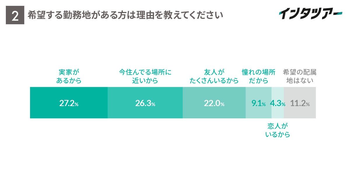 設問2では希望する勤務地がある場合に、その希望の理由について聞きました。最も多い回答は「実家があるから」27.2%で、次いで「今住んでいる場所に近いから」26.3%が多く、二つの回答で過半数を占めました。三番目には「友人がたくさんいるから」22.0%が続きました。馴染みのある土地を離れたくない、という思いが強いことがわかります。また、「希望の配属地はない」と回答した学生も11.2%と一割を超え、こだわりがない学生も一定数存在します。