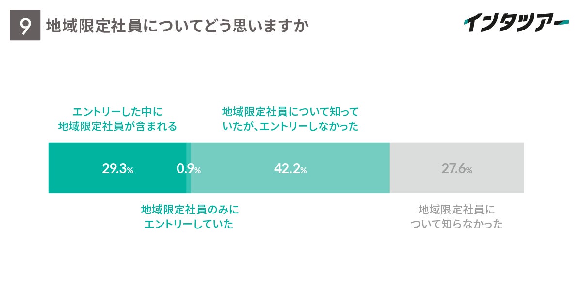 設問9では、勤務エリアが一定の範囲に限定される「地域限定社員」についてどう思うか聞きました。最も回答が多かったのは「地域限定社員について知っていたがエントリーしなかった」42.2%で、「エントリーした中に地域限定社員が含まれる」29.3%が続きました。「地域限定社員のみにエントリーしていた」0.9%を加えると、72.4%がこの制度(雇用形態)について認知していることがわかります。