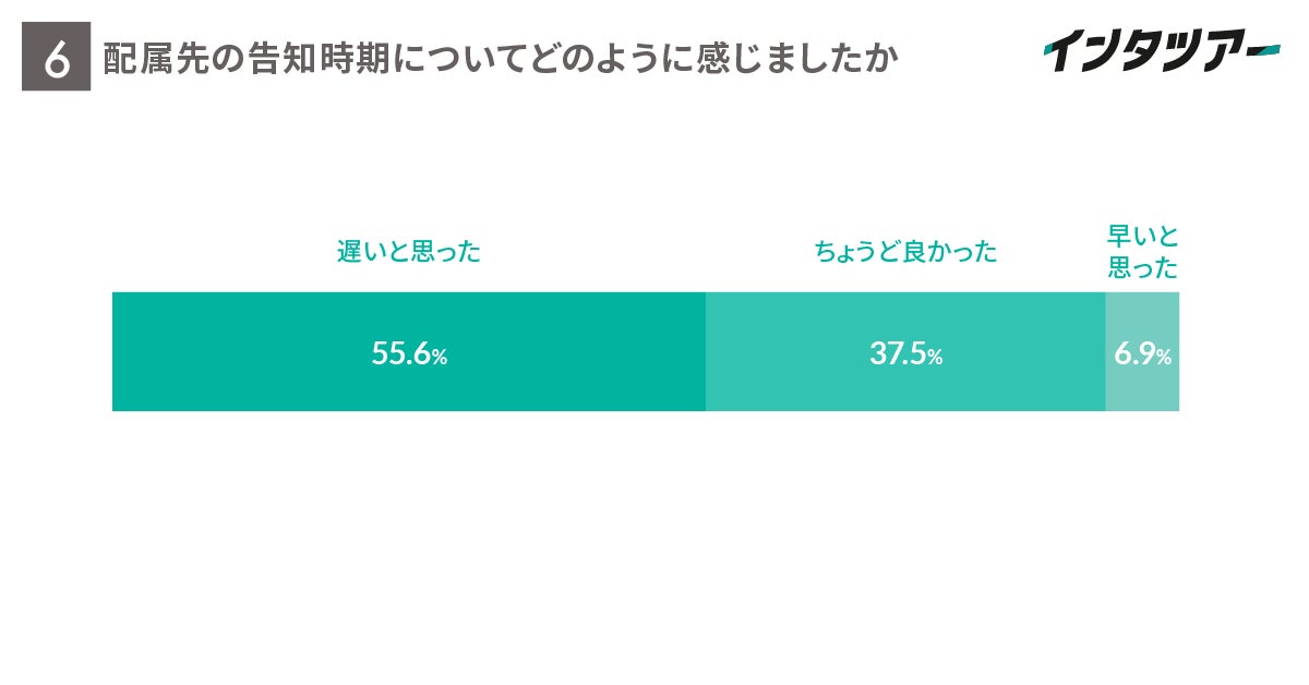 設問6では、配属先の告知時期についてどう感じたか聞きました。過半数の55.6%が「遅いと思った」と回答していました。