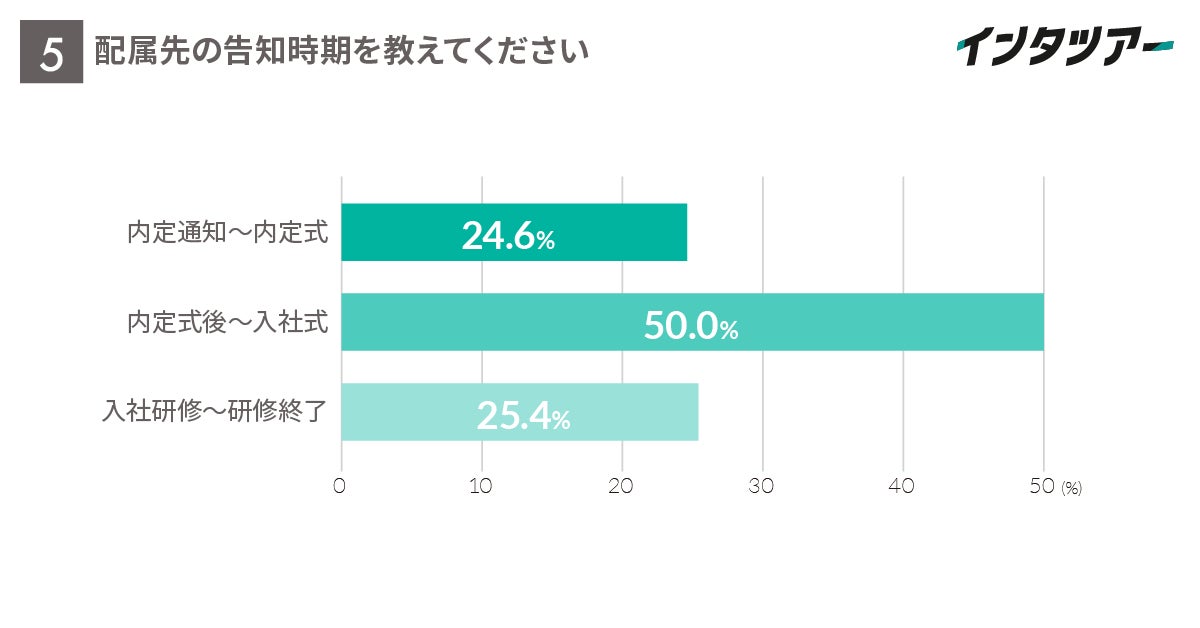 設問5では配属先の告知時期を3つに分けて聞きました。最も多かったのは「内定式後~入社式」50.0%でした。