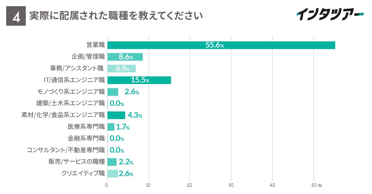 設問4では実際に配属された職種について聞きました。こちらの設問でも「営業職」55.6%が最多で、2番目には「IT/通信系エンジニア職」15.5%が続きました。回答した24卒生の9割以上が文系学生ということもあり、建築土木などの職種は希望・配属共に0となっています。