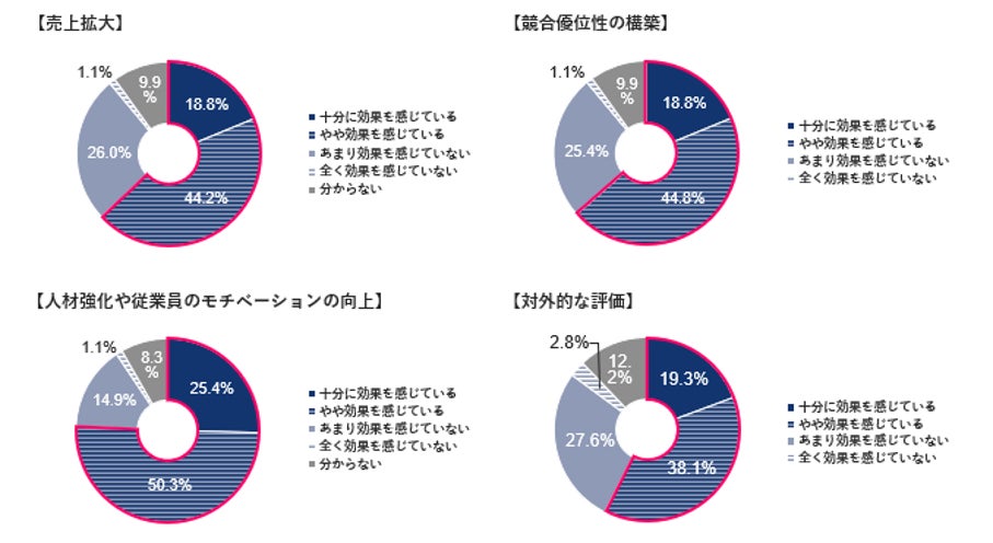 モチベーション向上」「対外的な評価」の4項目全てにおいて「やや効果を感じている」の回答が