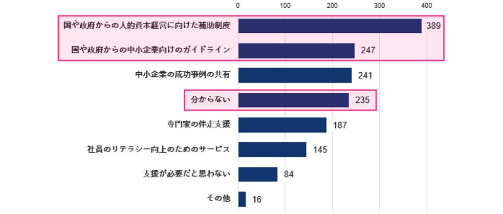 全回答者のうち最も多かった回答は、「国や政府からの人的資本経営に向けた補助制度」で389人にのぼった。