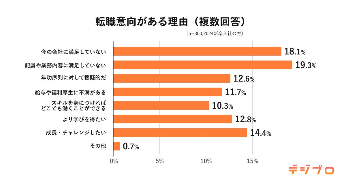 最も多かったのは「配属や業務内容に満足していない(19.3%)」、次いで「今の会社に満足していない(18.1%)という結果に。入社を決めたものの、会社の待遇や業務内容に不満がある状態であることがわかります。