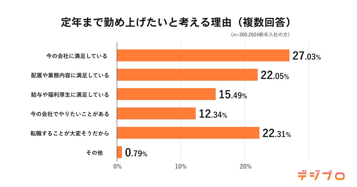 「今の会社に満足している(27.03%)」が最も多く、「転職することが大変そうだから(22.31%)」も回答を集めました。環境を変える転職や転職活動に対して、転職をするよりも今の会社にいた方がいいと考えている傾向が見えます。