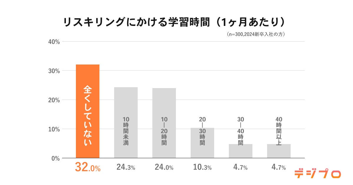 一方で、4月に入社したばかりの新卒社員の方が、現在どれだけ「リスキリング」を行っているか、自身のスキルアップや学びの時間をどれだけ確保して進めているかを調査した結果、「全くしていない(32.0%)」が最も多く、1ヶ月あたり「10時間未満(24.3%)」を上回りました。