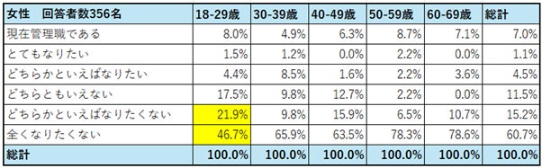 また、同じ質問を性別で見ると、30歳未満の女性は68.6%、30代の女性では75.6%にのぼり、管理職という立場がライフステージの変化に対して、ネガティブな要因と考えられていると推察できる結果となりました。